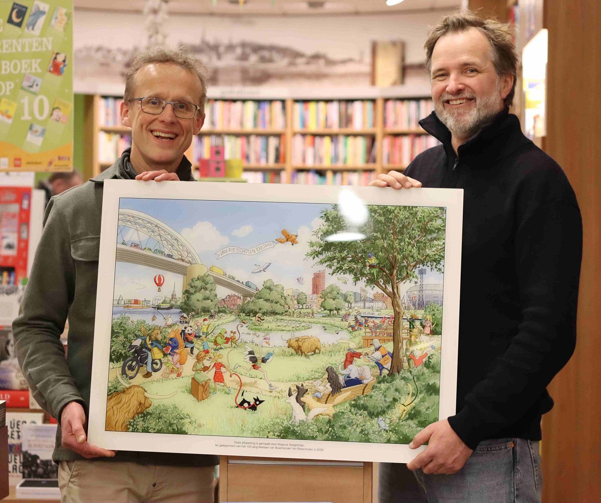 De afbeelding kan op groot formaat in onze boekhandel worden bewonderd. Verder zijn er posters beschikbaar die we graag cadeau geven aan wie IJsselmonde en Boekhandel Van Rietschoten een warm hart toedragen. We verklaren graag dankbaar voor 100 mooie jaren onze liefde aan de wijk IJsselmonde en haar inwoners.